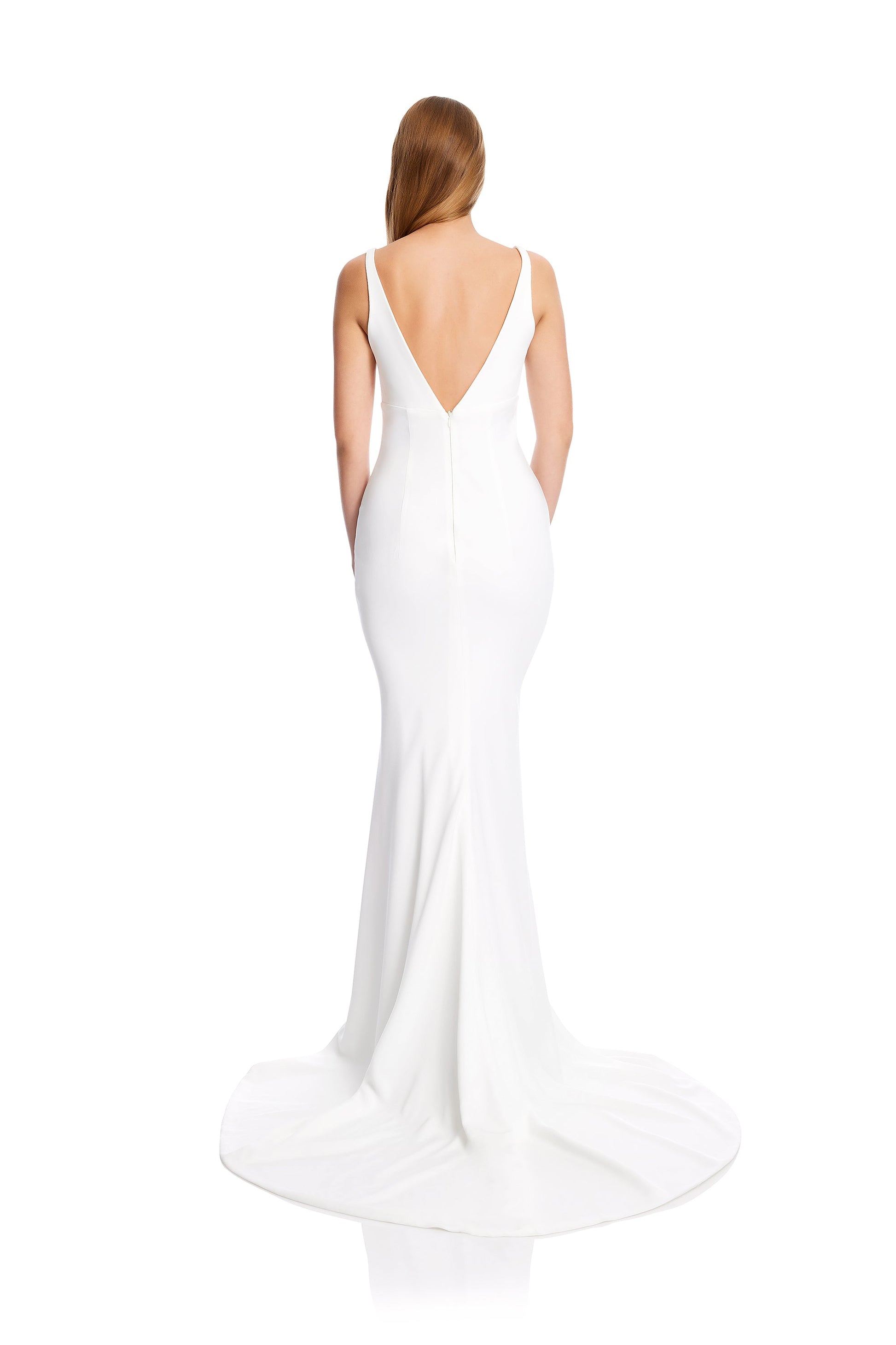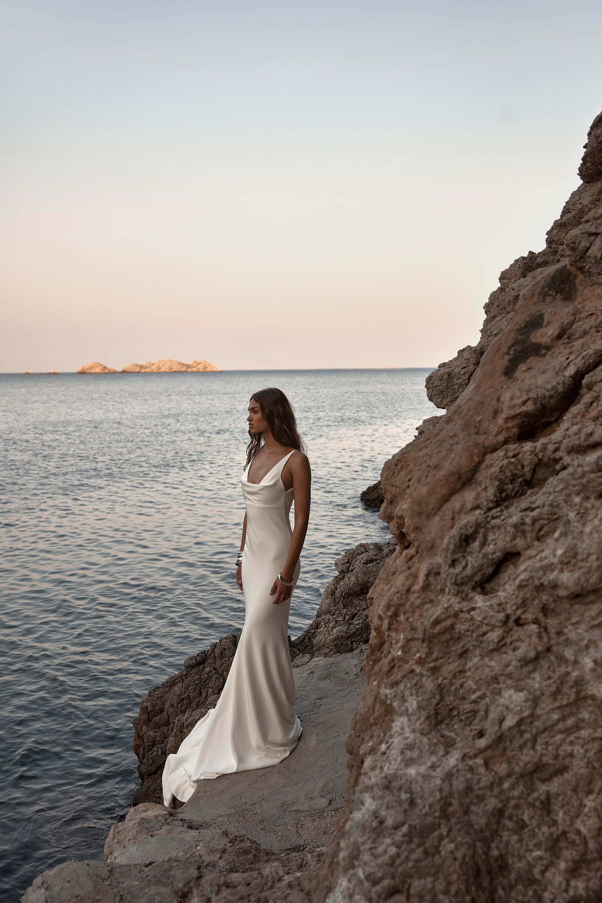 Channel 90s glamor in Bacall. Cut luxe triacetate, Bacall features an empire line bodice with a statement cowl neckline to bring effortless noughties minimalism to your bridal aesthetic.