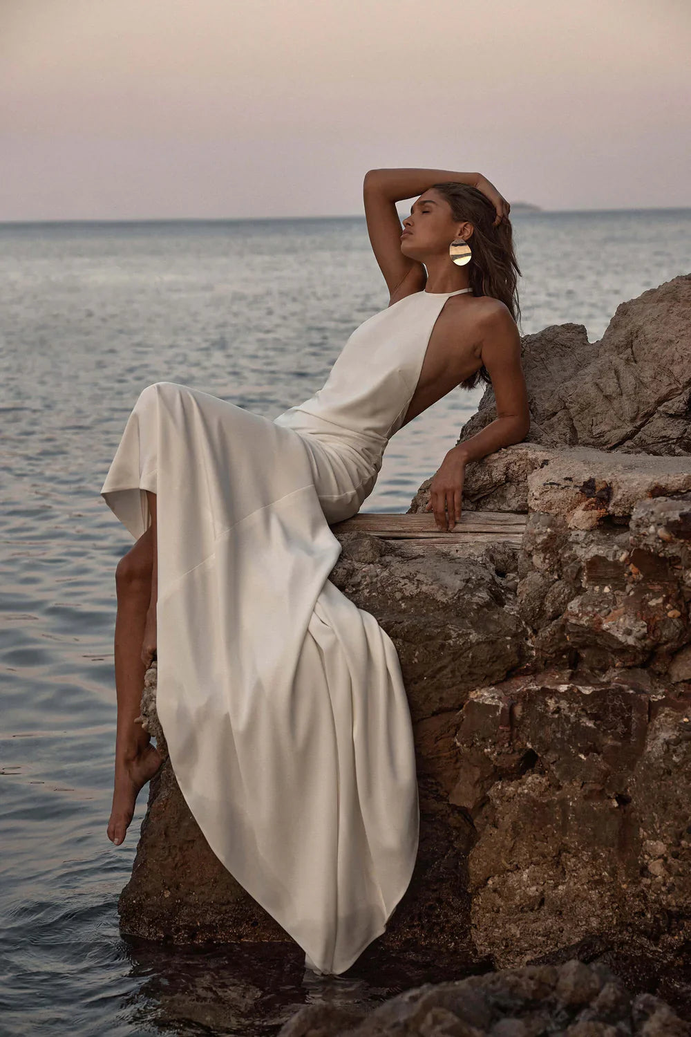 Answering the call for Y2K style in Elidi. Minimalism at its best, Elidi features a halter neck line and open back into a fit and flare skirt. Cut from luxe triacetate, Elidi is a study in pared back cool.