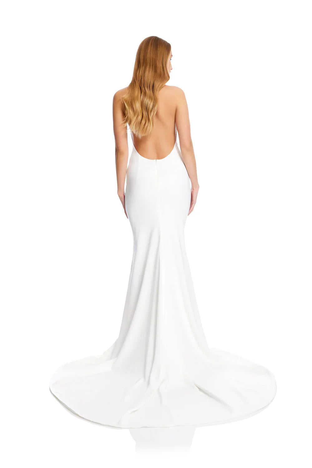 FIT: Bias cut gown. Relaxed bodice fit, fitting closer at the hip. Use hip measurement for sizing.