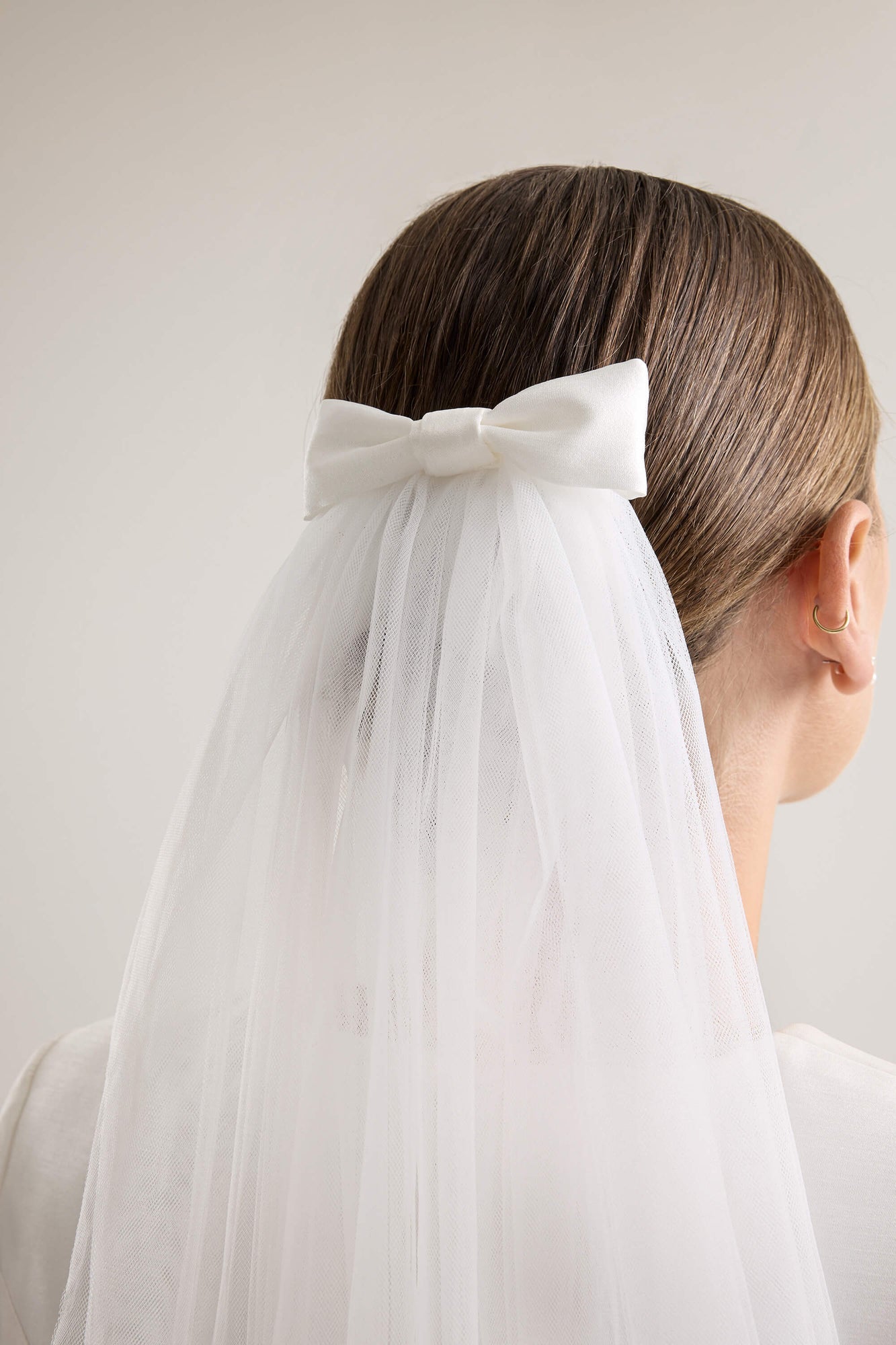 Featuring a classic bow detail in luxe taffeta, the Evander veil is crafted from a double layer of tulle to bring playful energy to your bachelorette or big day.