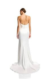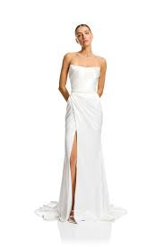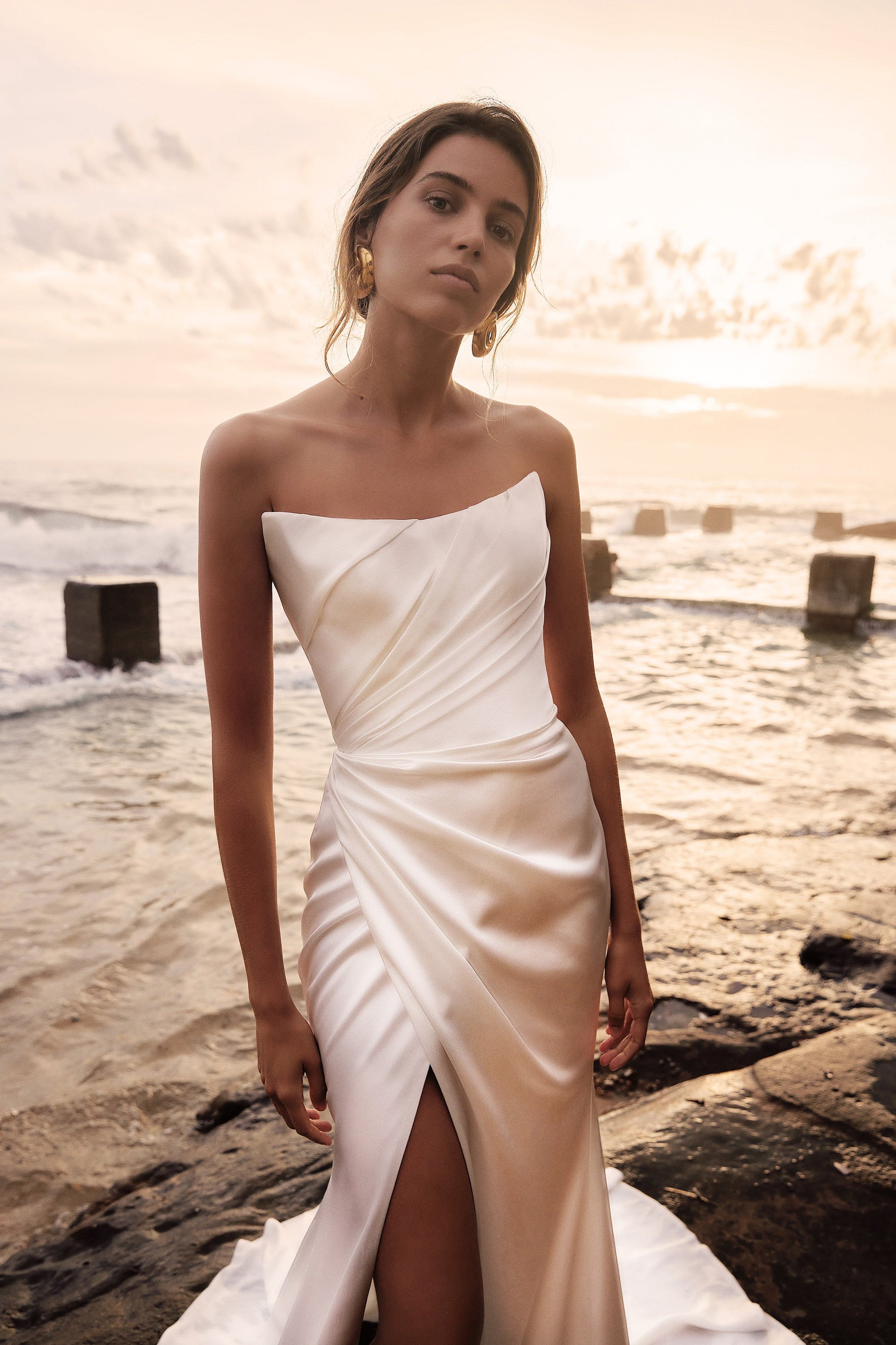 FIT: Structured bodice from Lucia in satin. Fit and flare skirt with split. Relaxed fit detachable sleeve. Size up if in between bust sizes.
