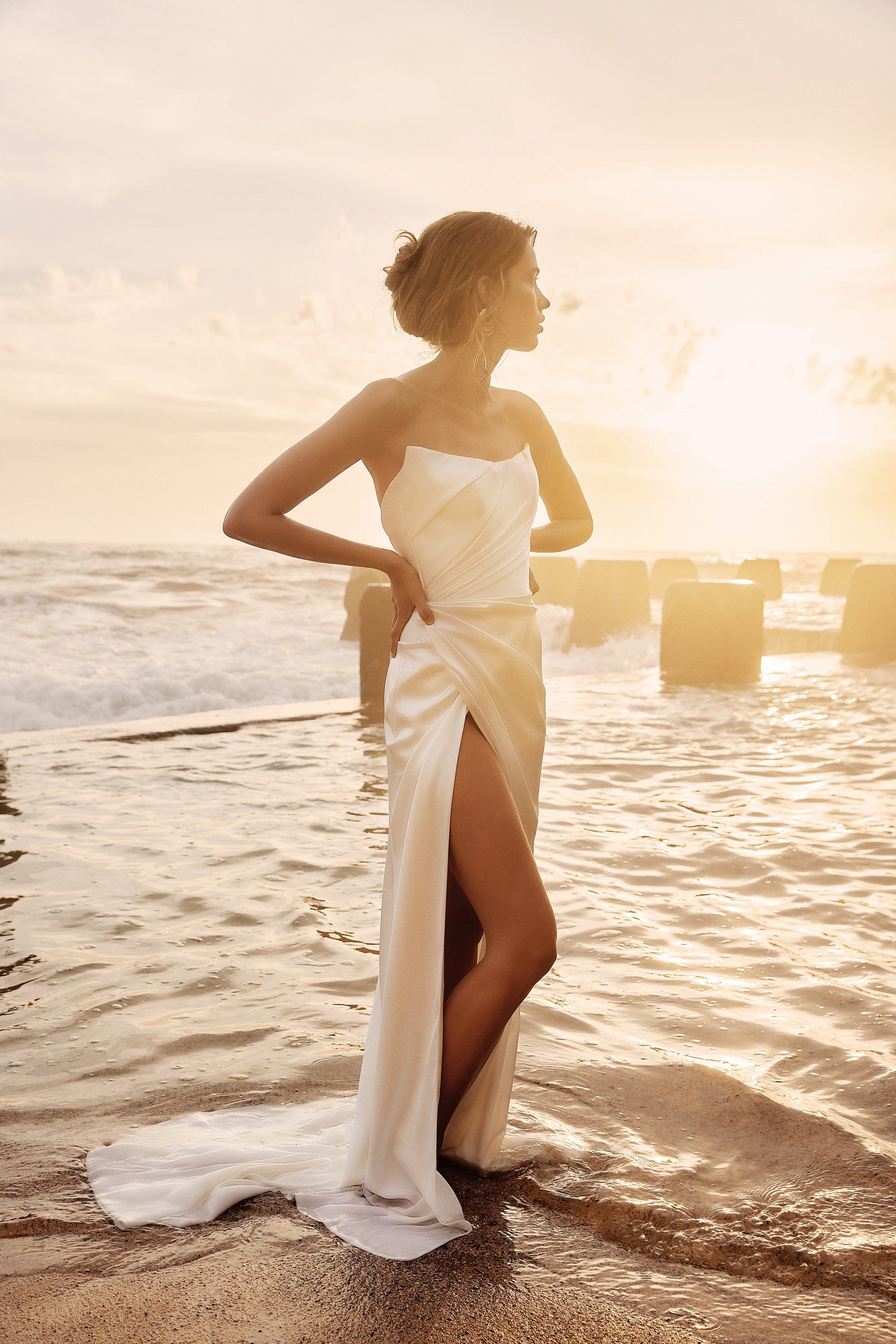 The incredible Chosen by Kyha Frances, Frances features the Lucia neckline with a drape detail, structured, dipped waist corset and draped wrap skirt.