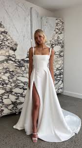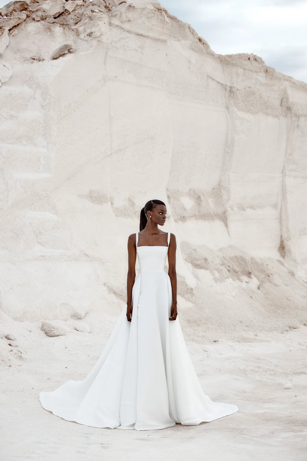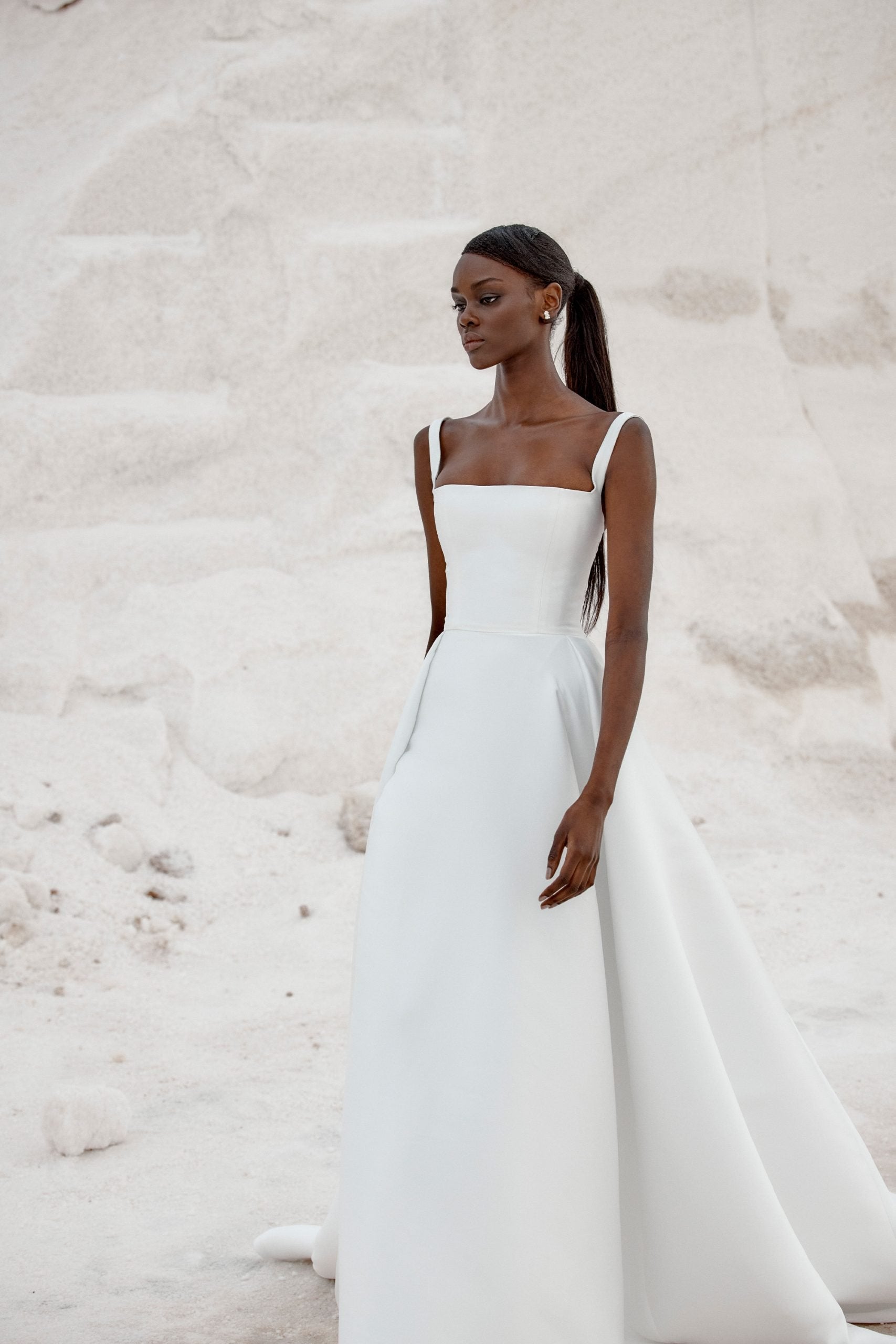 Set the dial to high drama when Luni enters the room. Maximalism made for minimalists, Luni combines a structured, scoop neck bodice with swathes of luminous duchess satin in a full skirt. Add a split to keep things fresh, and suddenly you're in the modern ballgown of your dreams.
