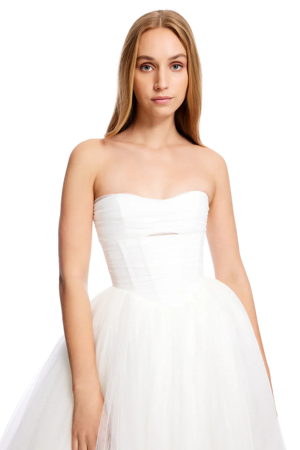 FIT: Structured bodice with small cutout at underbust. Full ballgown skirt gathered into dipped waist.