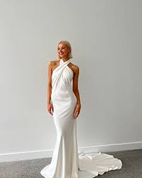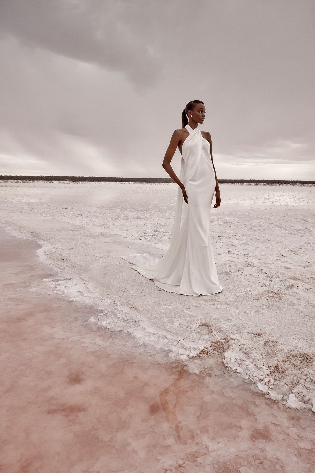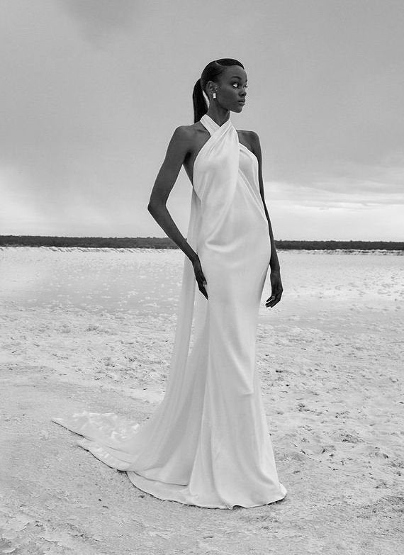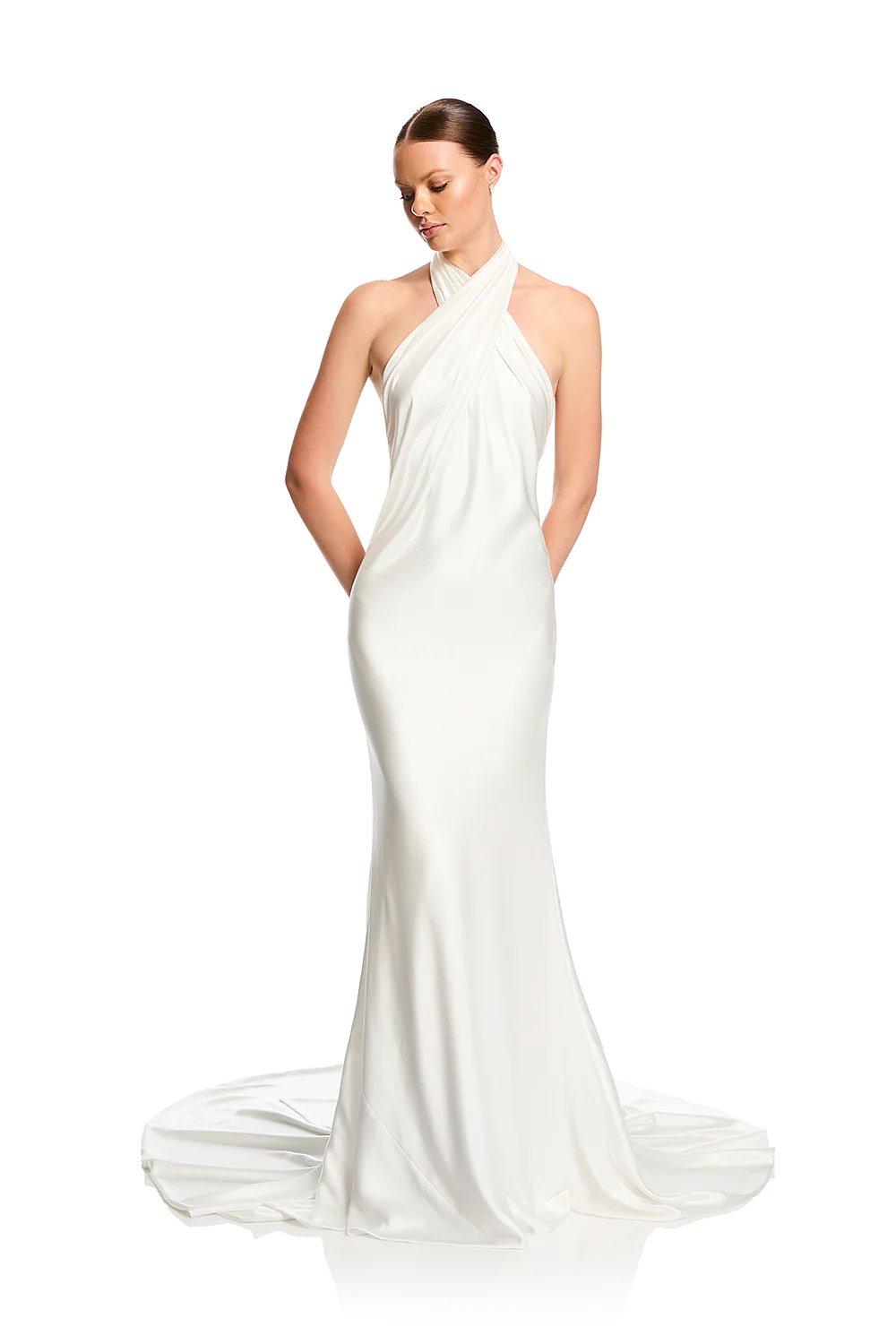 Evoke 90s minimalism with Maras. This relaxed-fit halter crosses at the bust and long neck ties extend to the length of the train. Maras' gentle fit and flare silhouette, low back and satin finish are sleek moments made.