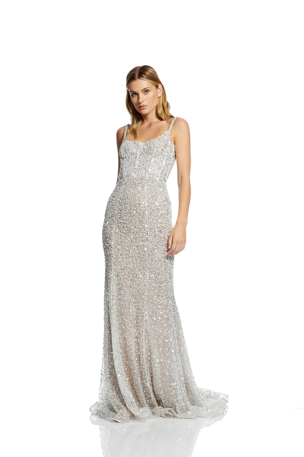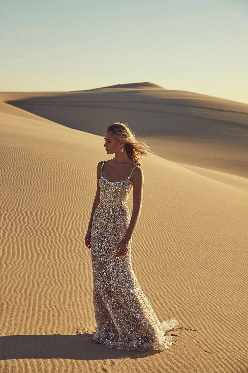 True to its name, Muse's distinctive embellishment and modern silhouette inspires love. Bespoke Chosen by KYHA beading means Muse's corseted bodice and fit and flare skirt catches all the light. Perfect for a combination of structure, support and drama, it is easy to see why Muse is fast becoming a modern classic.