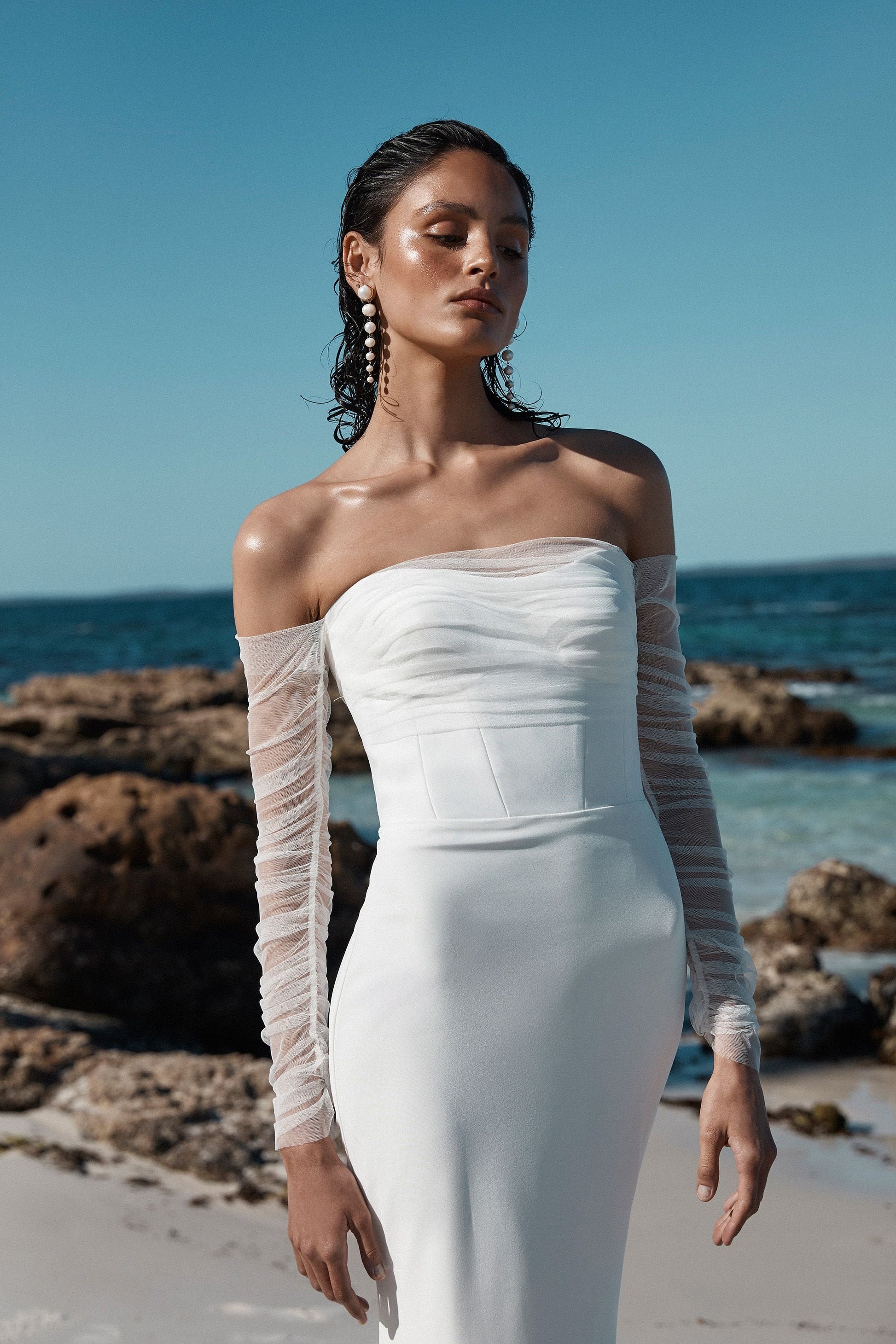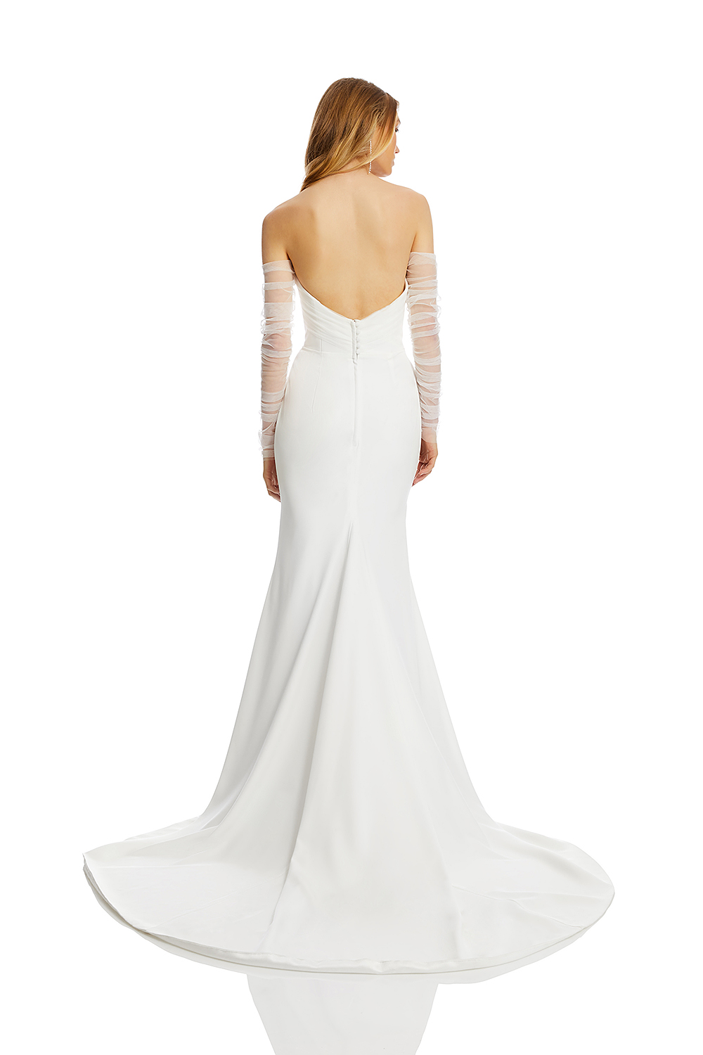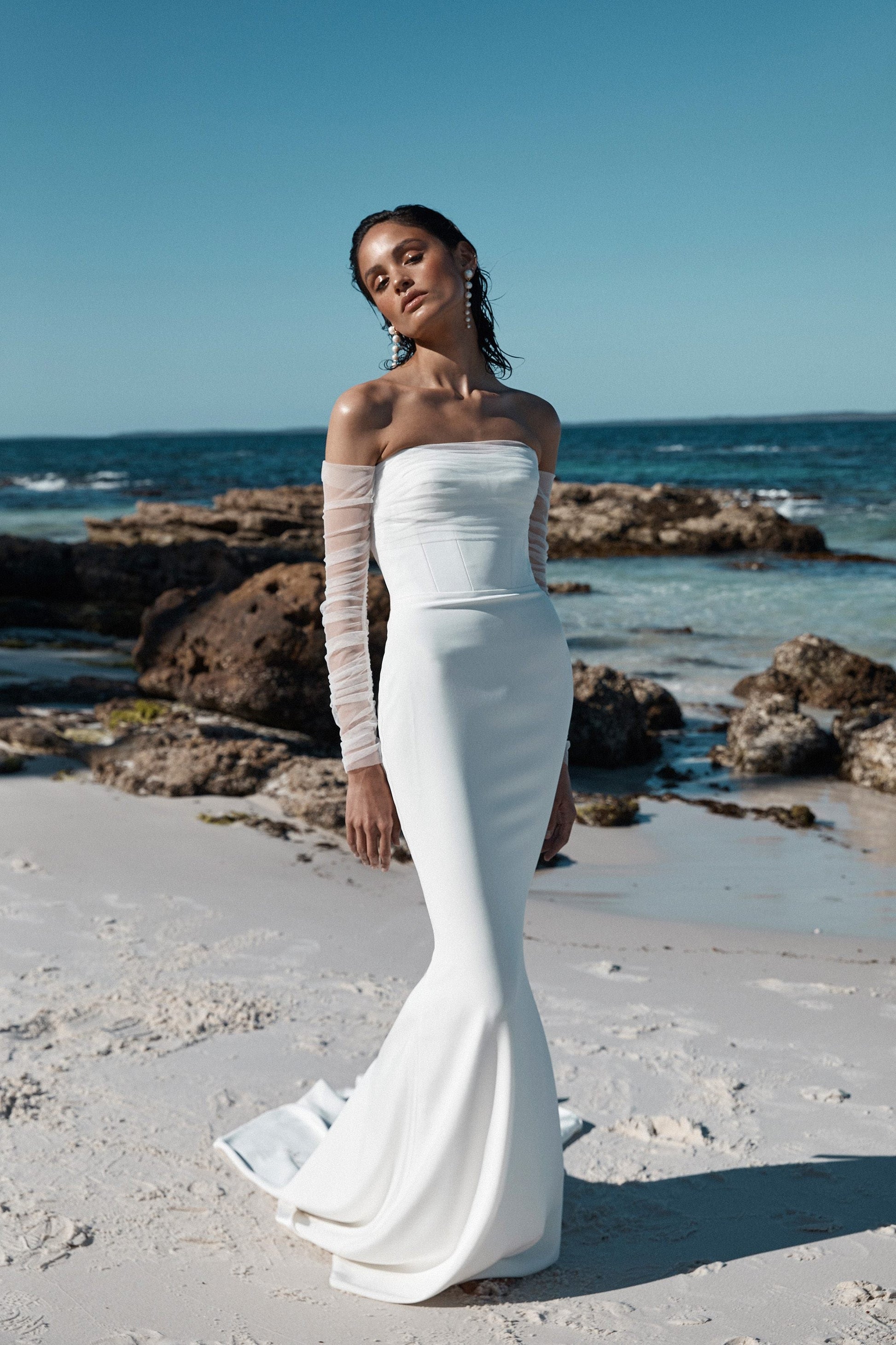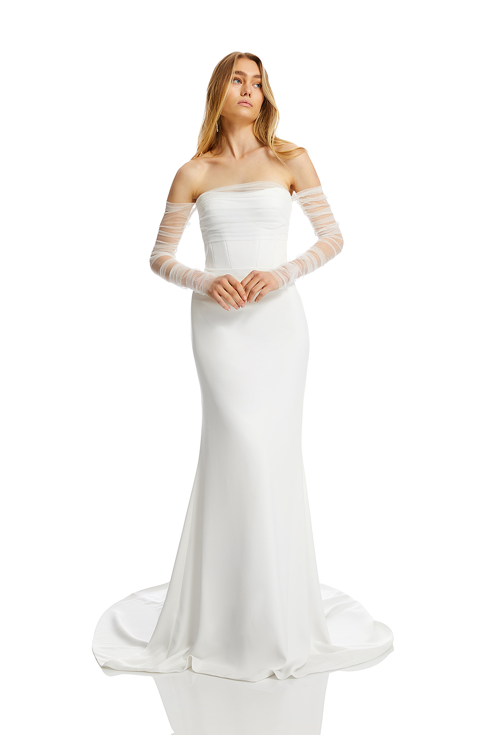 Made for minimalists, Ziva is a lesson in pared-back cool. Hand draped tulle wraps the bust and into a dipped back neckline, finished with ruched tulle sleeves. A structured bodice with a soft sweetheart neckline creates a flawless fit.